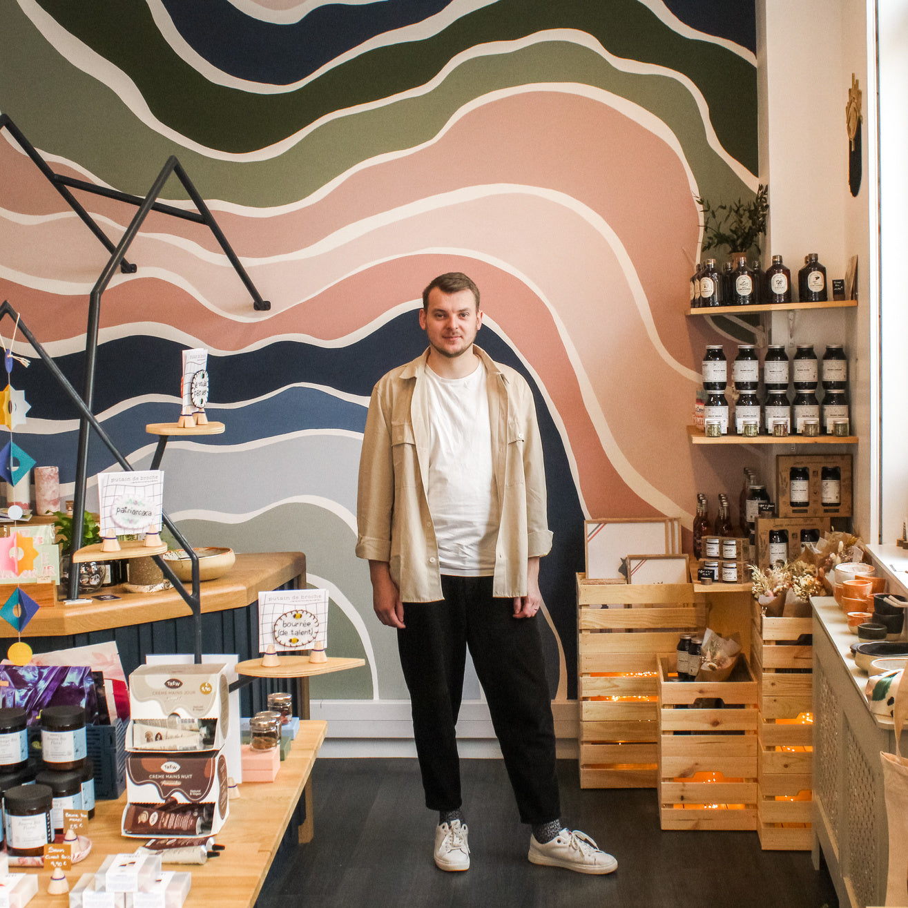 Dans la continuité de mon engagement, il me semblait cohérent de pouvoir aider un artiste à vivre de son rêve. En contrepartie de l’emplacement, il m’aide pour toute la communication de la marque. Et surtout, nous nous soutenons moralement ! Avoir un atelier à l’étage permet aussi de transformer un lieu de passage, comme une boutique, en lieu de vie.