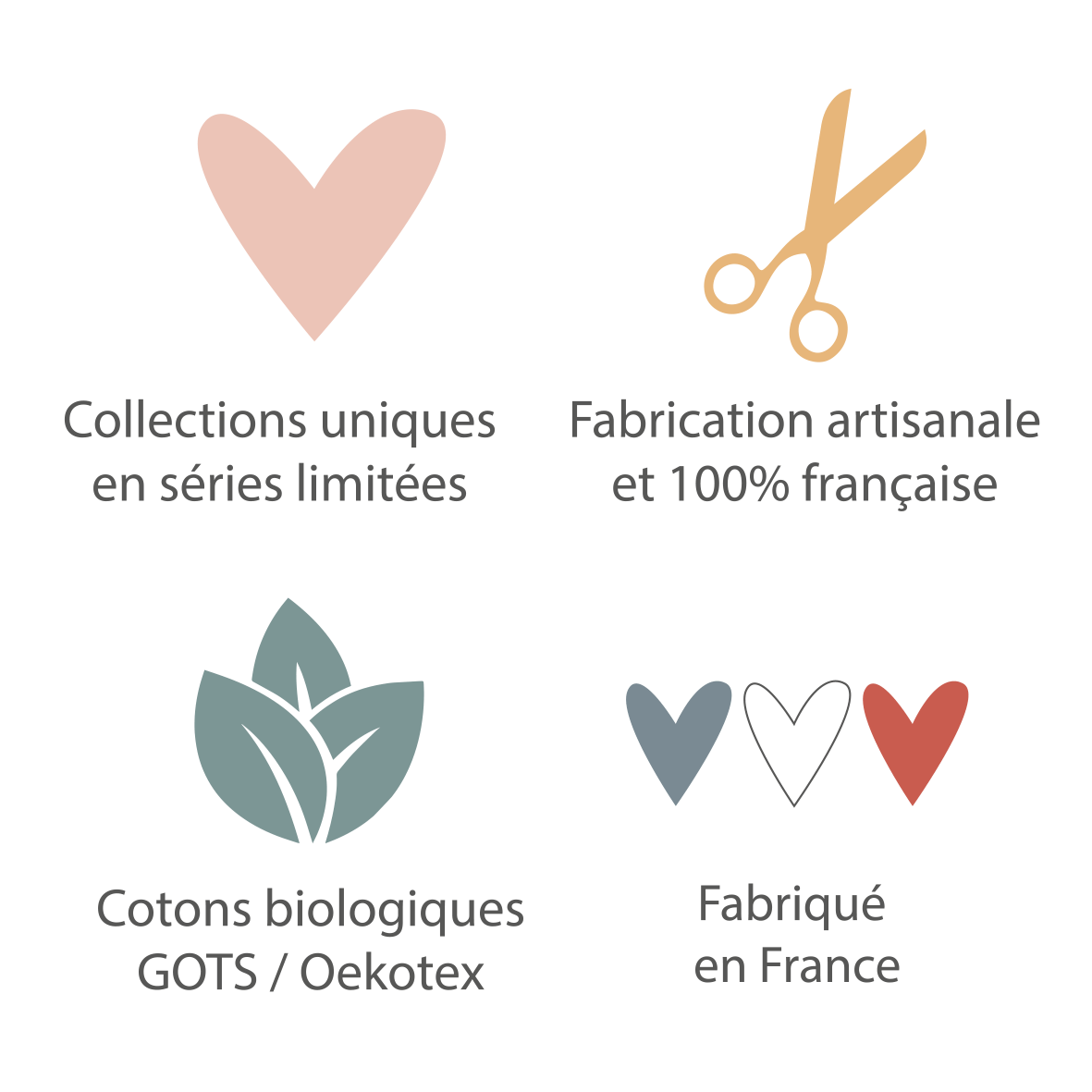 Les tissus sont sélectionnés avec soin, sans substance nocives, pour garantir tout le confort nécessaire à bébé.